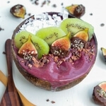 - Transfer smoothie to a bowl and top with frozen kiwi, chia seeds, figs, cacao nibs and coconut flakes.