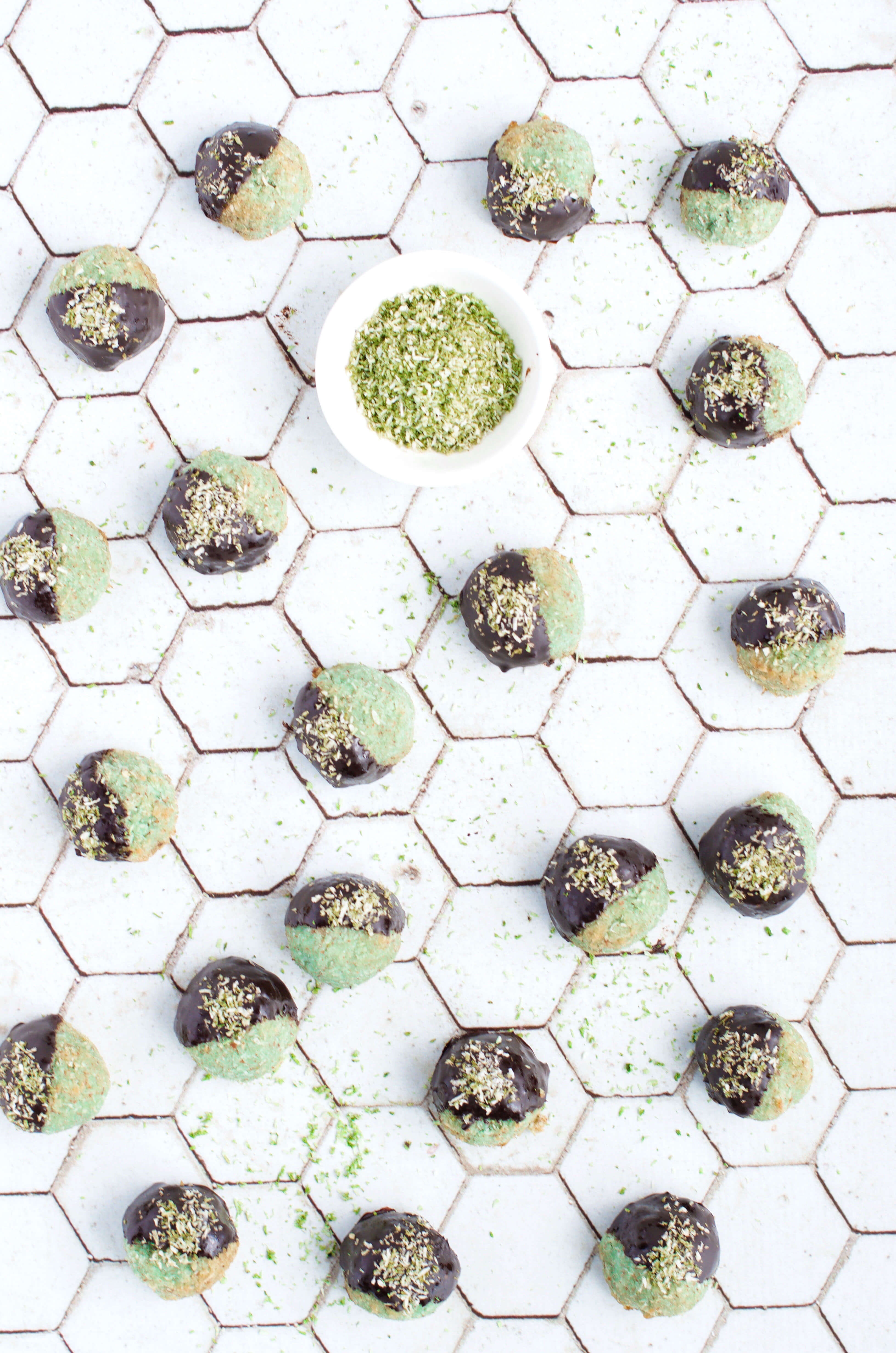 Think mint-flavored and chocolate-dipped chewy coconut macaroon minus egg whites and refined sugar.