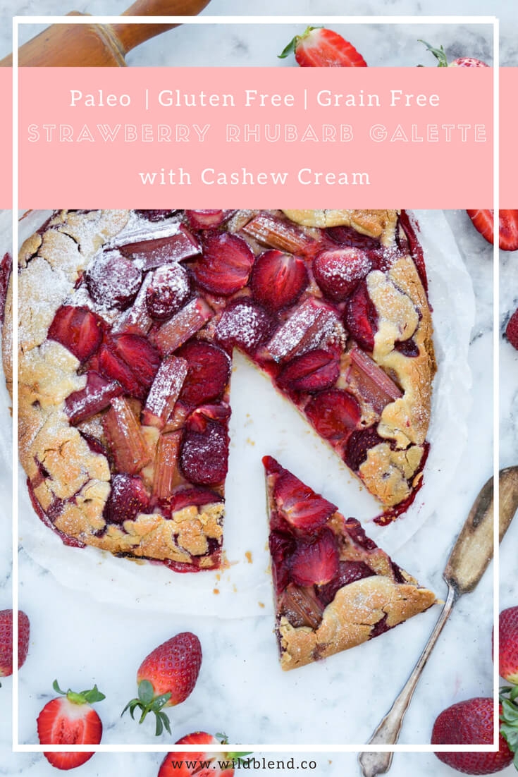 This Strawberry Rhubarb Galette is made with sweet strawberries, tart rhubarb and dairy free cashew cream, all wrapped into a nutty almond flour crust that you would never guess is gluten-free and Paleo friendly (with Vegan option too).