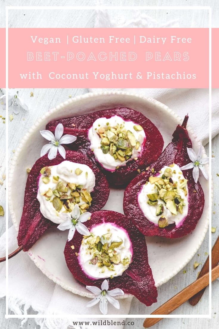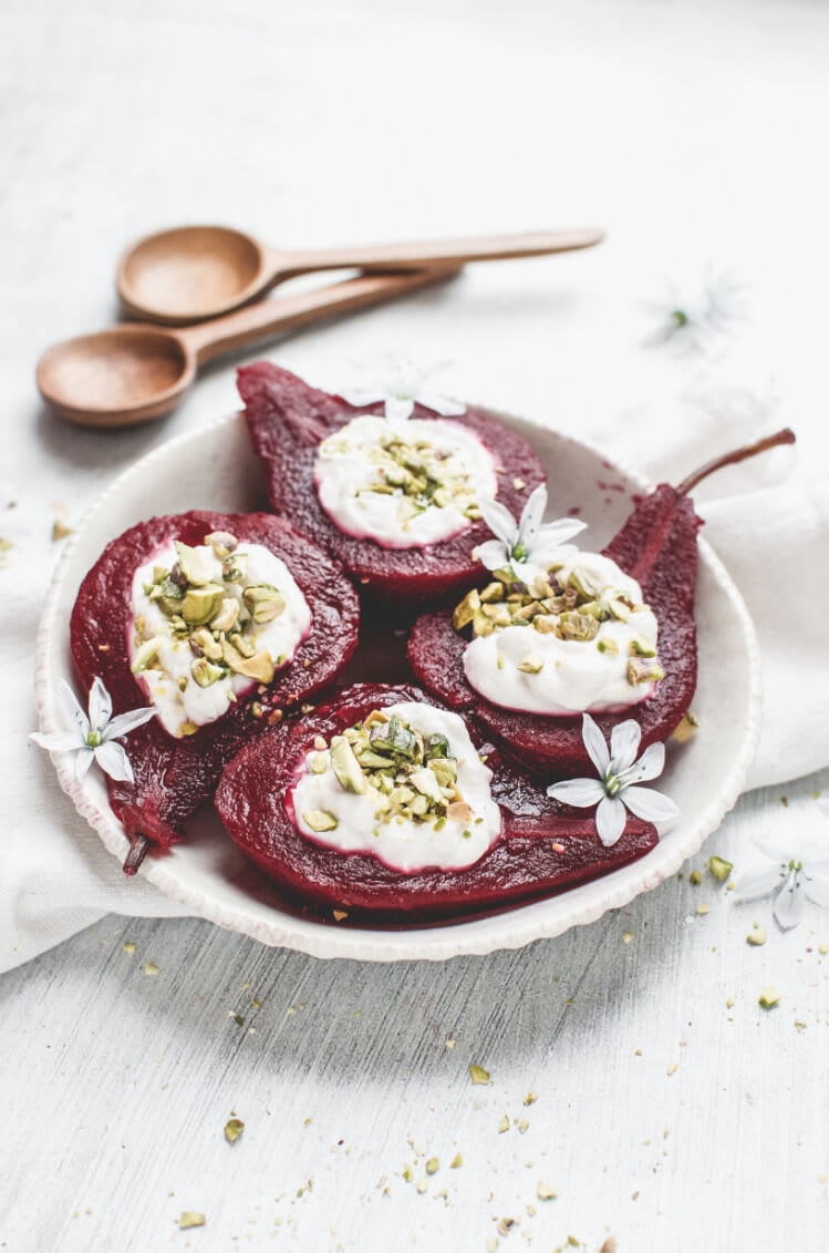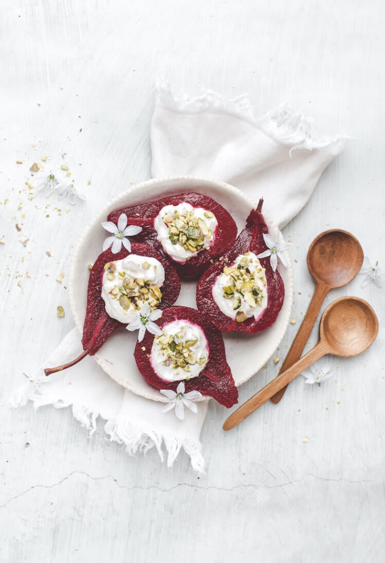 Beet-Poached Pears with Maple Coconut Yoghurt and Pistachios
