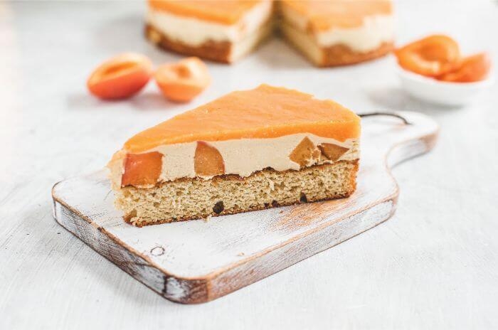 - Evenly spread diced apricots on top of the sponge base and cover with cheesecake cream.