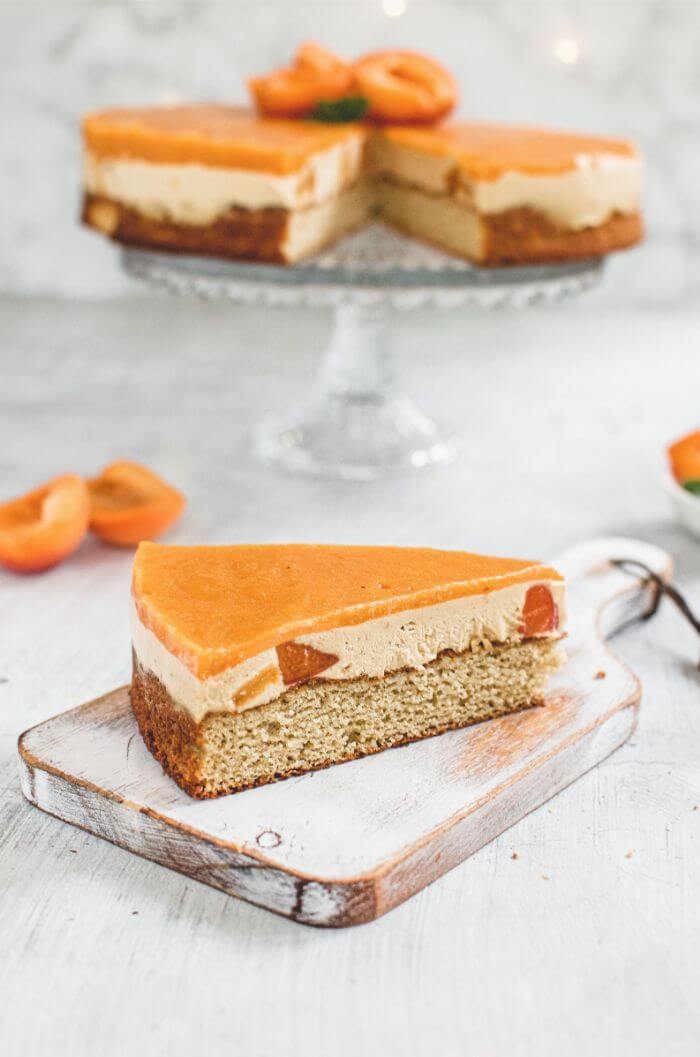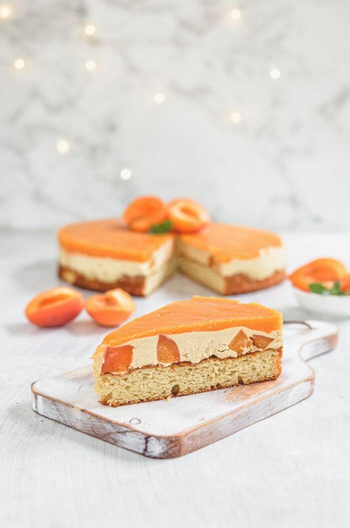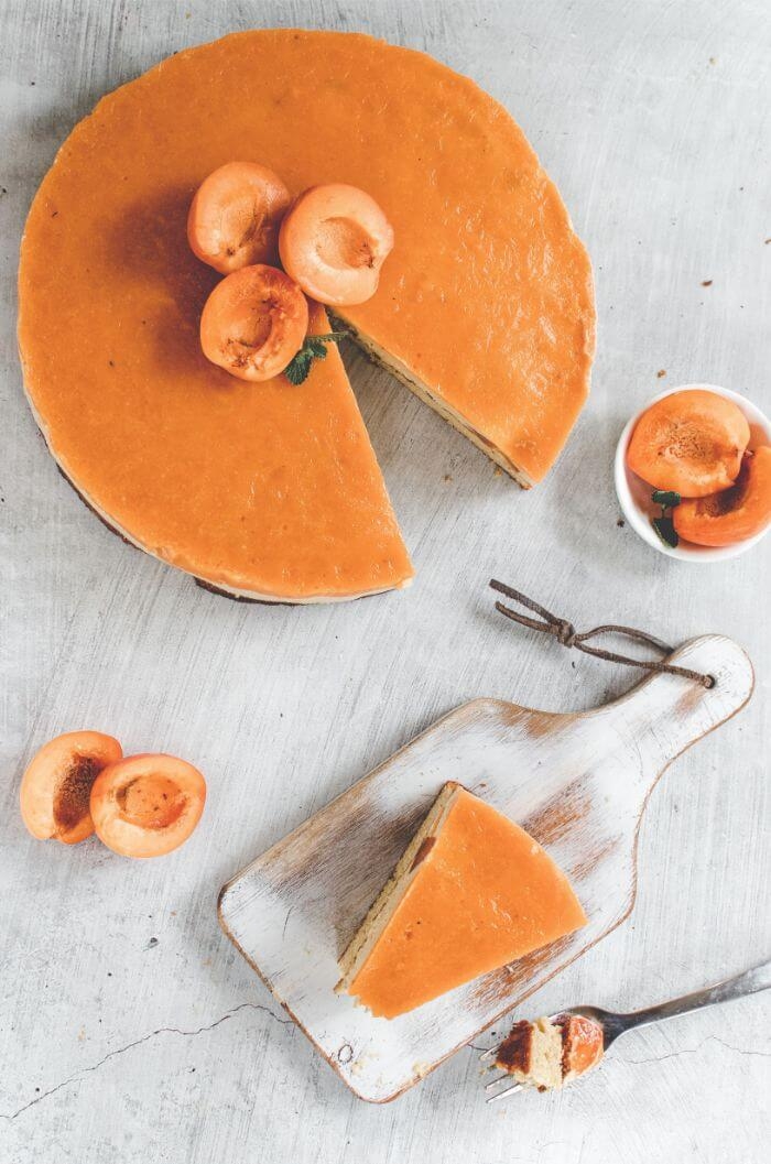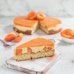 This dreamy 3-layer apricot cheesecake combines cashew-based cheesecake cream with a sticky apricot jelly and a gluten-free vanilla sponge base.