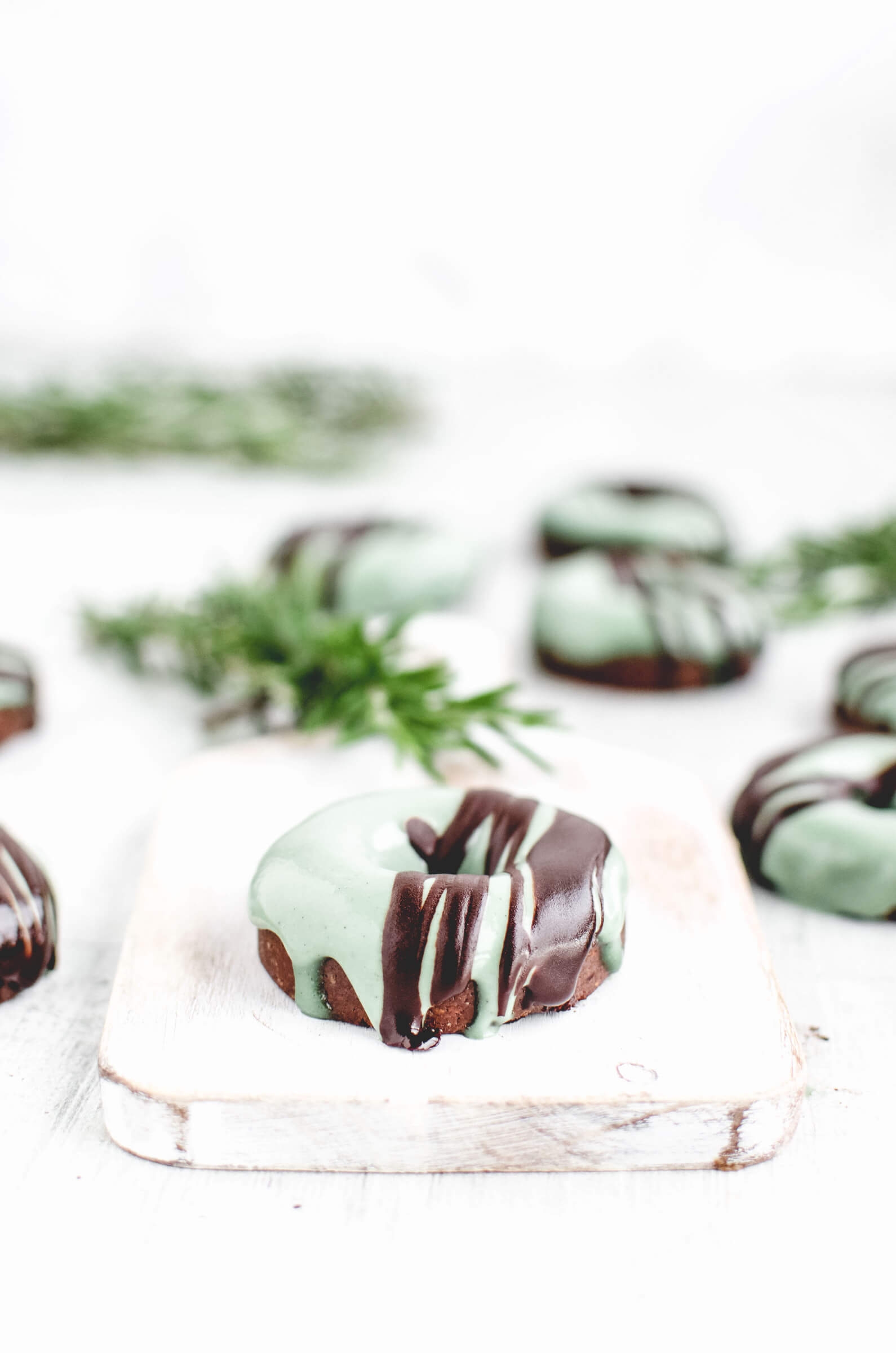 These donuts are delicious enough to eat without frosting, but I recommend adding the glaze because it adds such a lovely splash of colour and additional mint flavour to the donuts. If you’re in a rush or prepping your donuts ahead of time, store the glaze and donuts in the refrigerator in separate containers. When you’re ready to indulge, dip the donuts in the glaze and decorate with (optional) melted chocolate. Store them in an airtight container in the fridge and enjoy with a cup of coffee or Matcha latte.