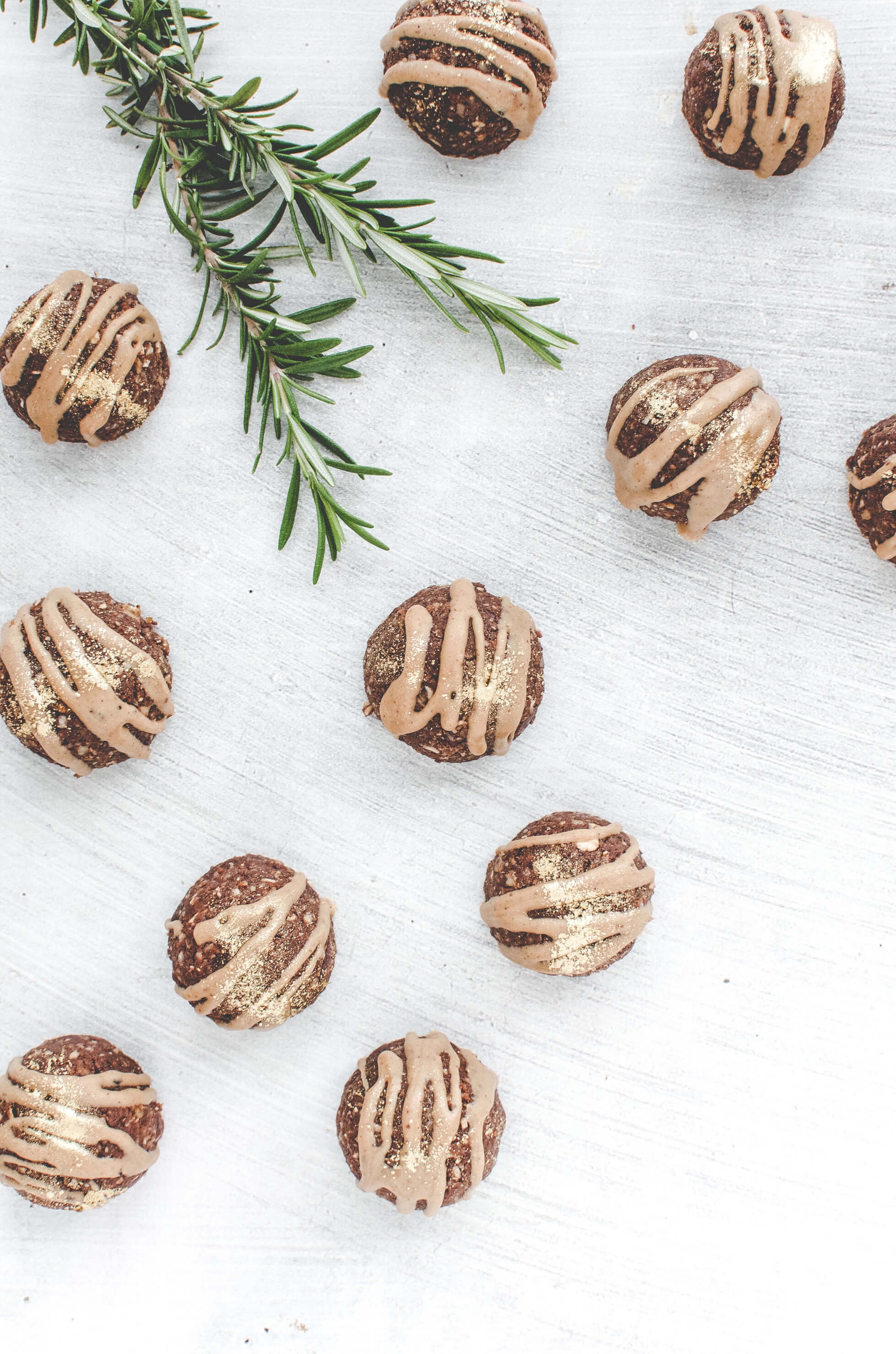 - Snip off one corner of the sandwich bag and carefully drizzle the gingerbread protein balls with the chocolate gingerbread mixture (basically use it like a piping bag).